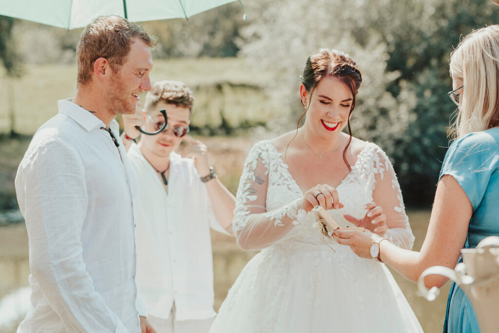 „Wenn Ihr eine Traurednerin sucht, die mit ganzem Herzen dabei ist und weit mehr leistet, als nur kurz vor der Trauung aufzutauchen, dann ist Nadja genau die Richtige. Mit ihrer warmherzigen und liebevollen Art hat sie für uns eine einzigartige und vor allem emotionale Zeremonie gestaltet.“